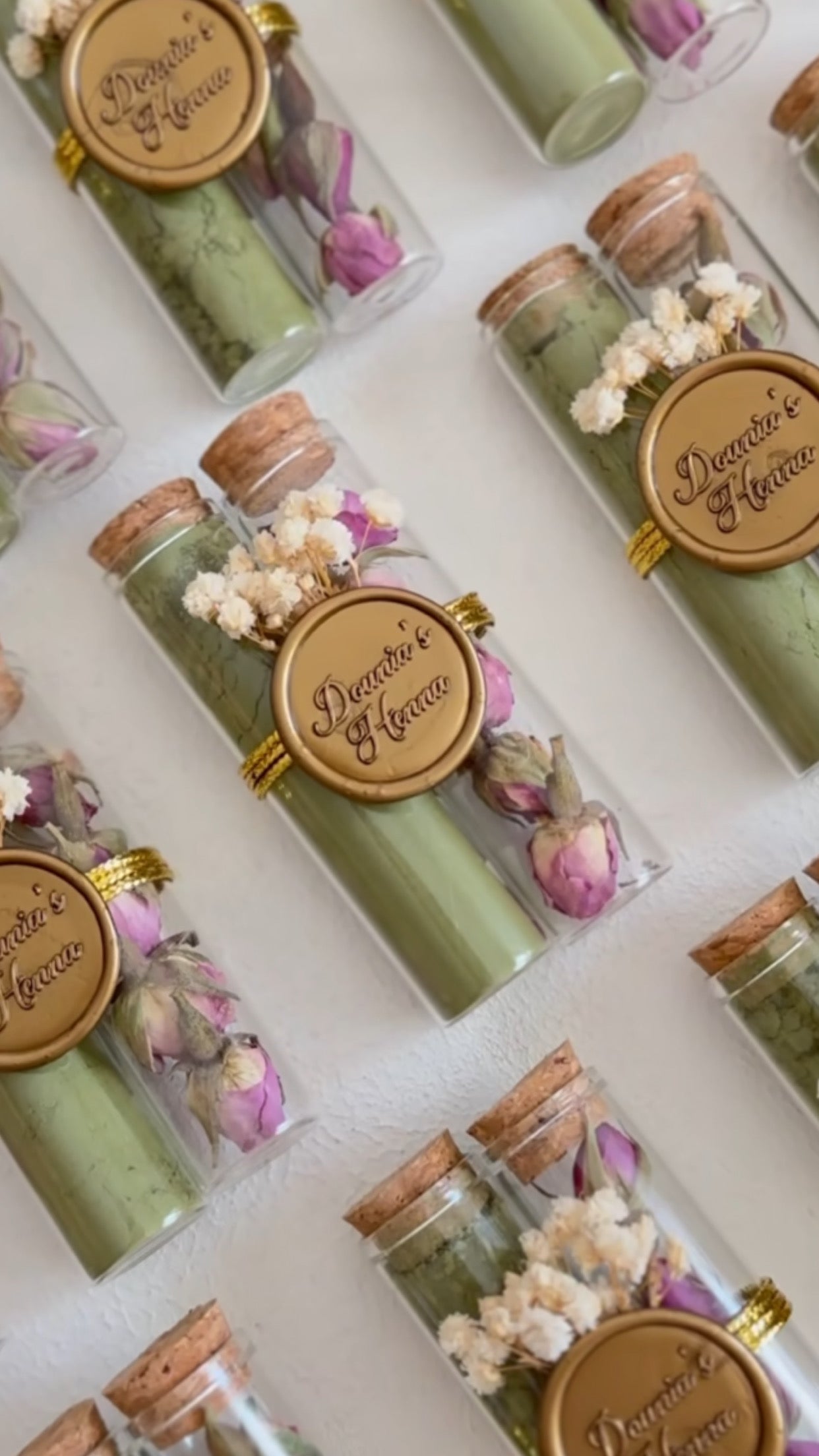 Deux fioles délicatement liées, l’une remplie de henné, l’autre de roses séchées. Un souvenir simple et raffiné, empreint de tradition orientale, parfait pour célébrer le jour du henna et remercier vos invités avec douceur.